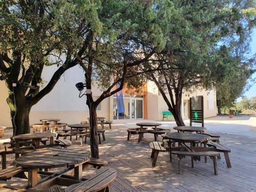 La terrasse en bois située entre les bâtiments du Sanglier et du Gandar peut accueillir en moyenne 200 personnes réparties sur 25 tables rondes en bois de 8 places. Lors de repas plus important, il est possible de rajouter des tables pour accueillir 300 personnes. En bordure, un barbecue permet à nos cuisiniers de faire d'excellentes grillades et apporte un côté convivial aux repas pris à l'extérieur. Pour vos regroupement familiaux, la terrasse jouxte la salle animation permettant ainsi de prolonger la fête à l'extérieur grâce à l'éclairage dernière génération aux ambiances lumineuses très ludiques.